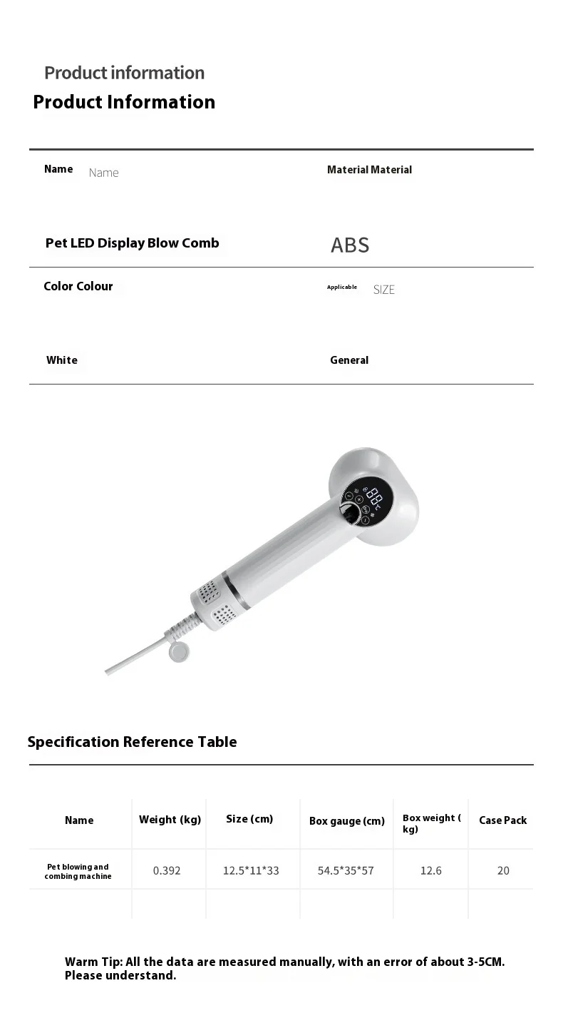 SPECIFICATIONSBrand Name: NoEnName_NullChoice: yesHign-concerned Chemical: NoneItem number: Pet blowing and combing machineMaterial: ABSModel Number: BC001Occasions for gifts: wedding, partyOrigin: Mainland ChinaProduct Categories: GroomingProduct Name: Blowing and combing machineProduct Size: 26cm*12cmRotational speed: 40000Suitable: All petsVoltage: 220Vsemi_Choice: yes